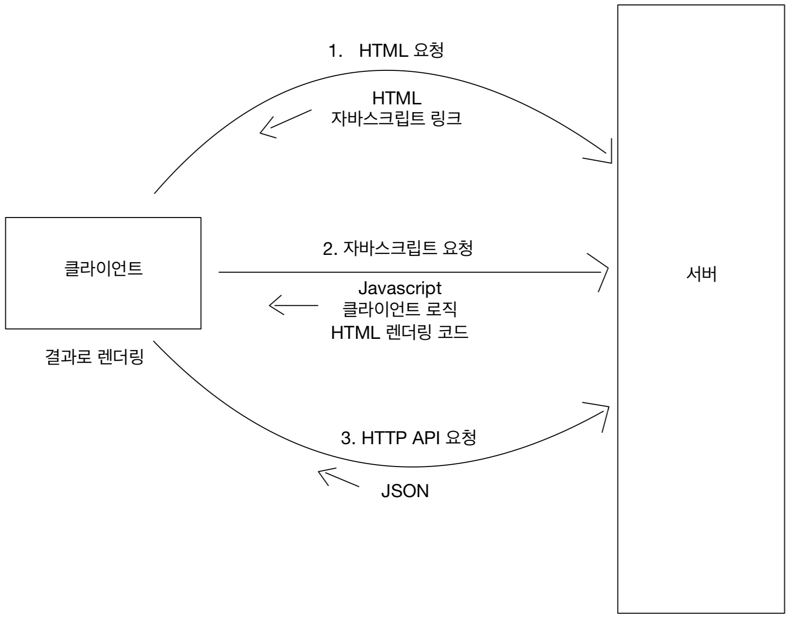 | HTML 최종 결과를 서버에서 만들어서 클라이언트에 전달 | HTML 결과를 자바스크립트를 사용해 동적으로 생성해서 적용 |
