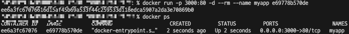 이렇게 -d 옵션을 넣어주면, 이전과는 다르게 바로 컨테이너가 실행되었다고 나오고 터미널과는 분리되는 것을 볼 수 있다.