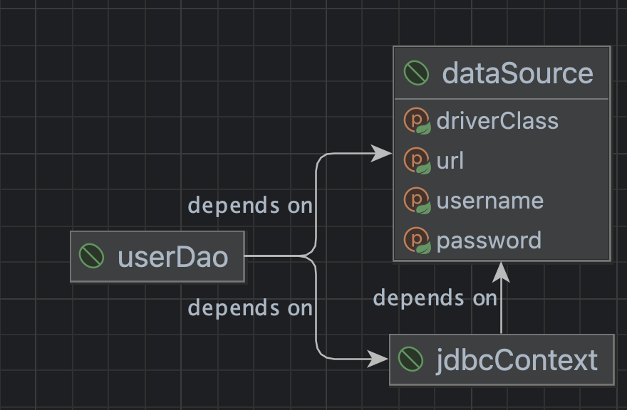 - JdbcContext가 DI를 통해 다른 빈에 의존하고 있기 때문이다. (Datasource에 의존)