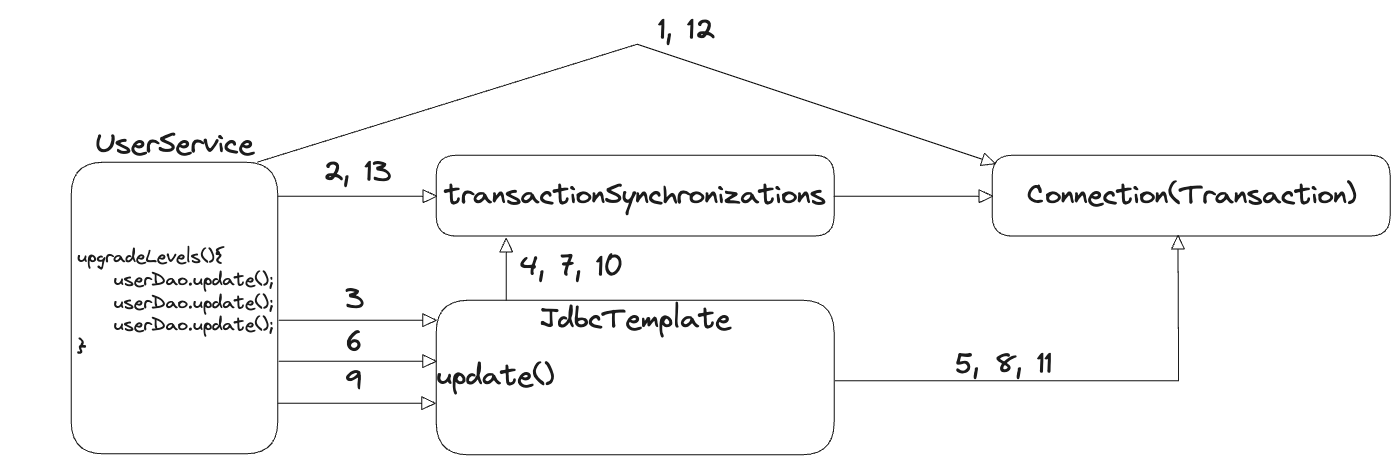 이렇게 외부에서 트랜잭션을 관리하더라도 UserDao를 수정할 필요가 없는 이유는 JdbcTemplate이 지원하는 기능 때문이다.