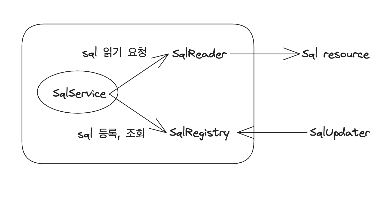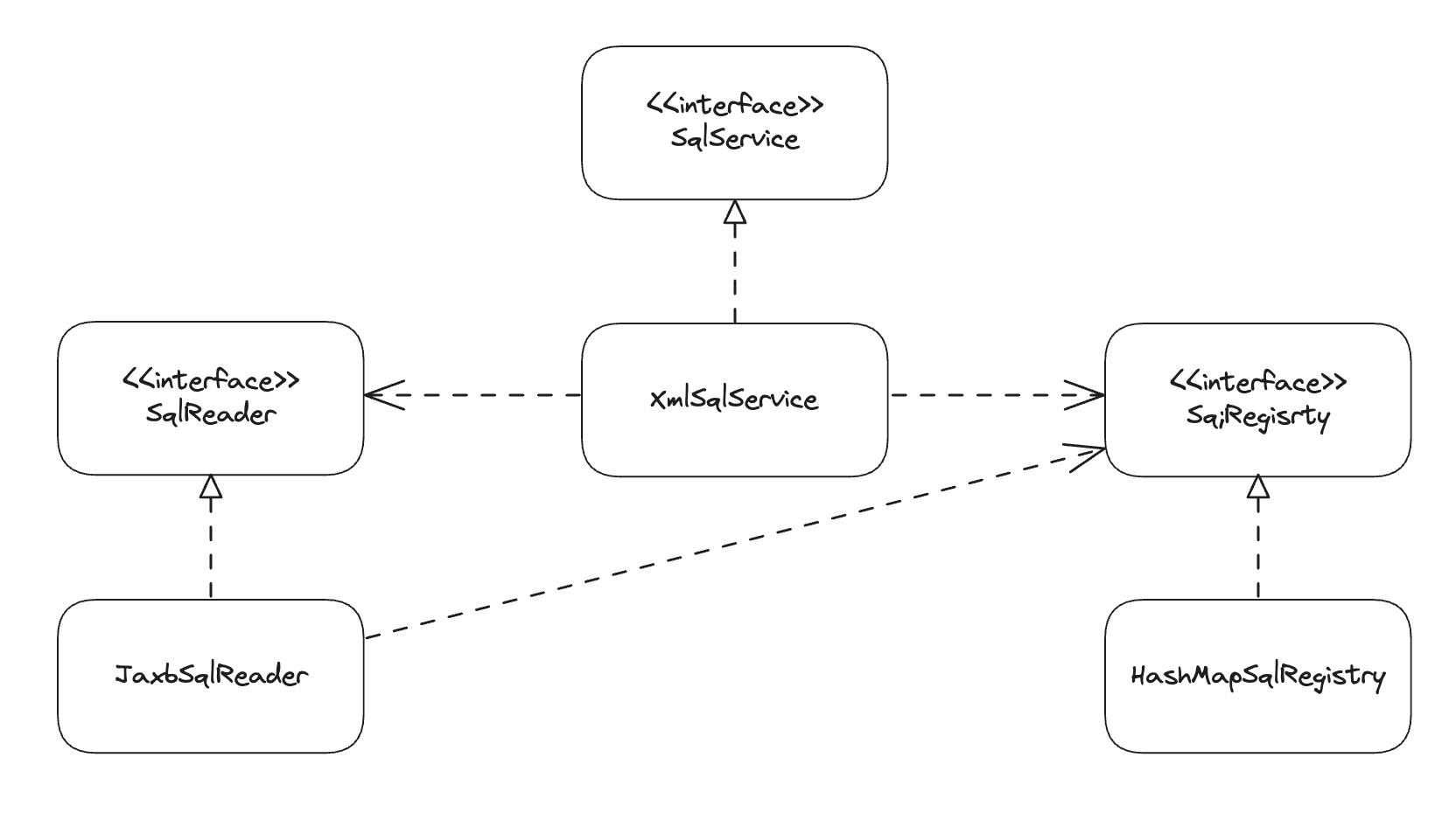 XmlSqlService는 SqlService와 SqlRegistry라는 전략을 사용하도록 구성되었기에, 이 2가지를 최대한 활용하여 만들면 된다.