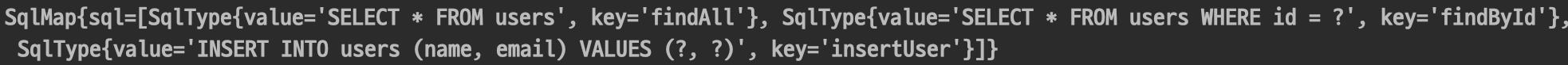 <sql key="insertUser">INSERT INTO users (name, email) VALUES (?, ?)</sql>