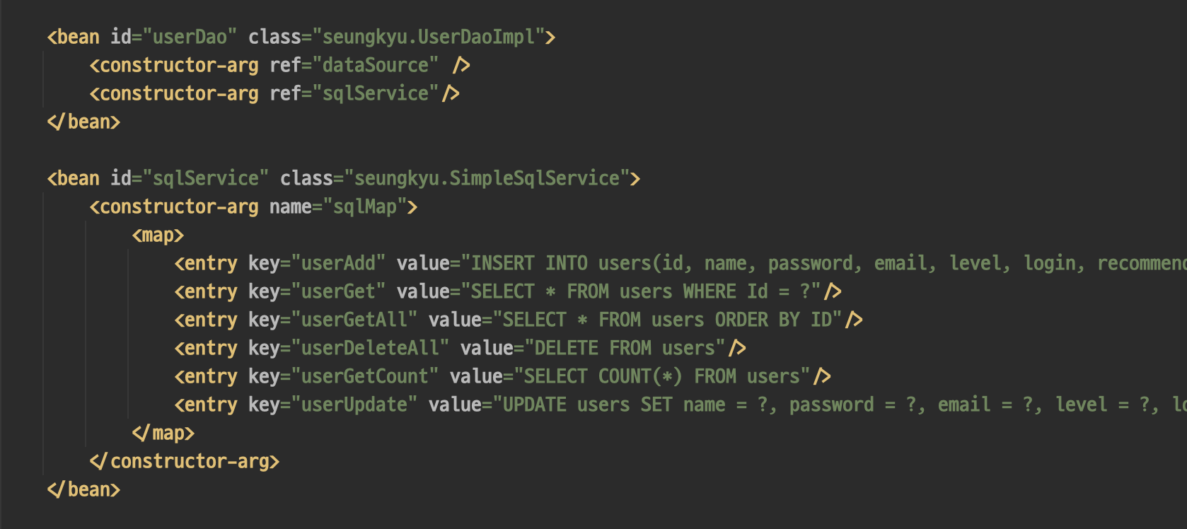 <bean id="sqlService" class="seungkyu.XmlSqlService">