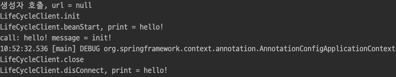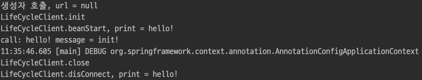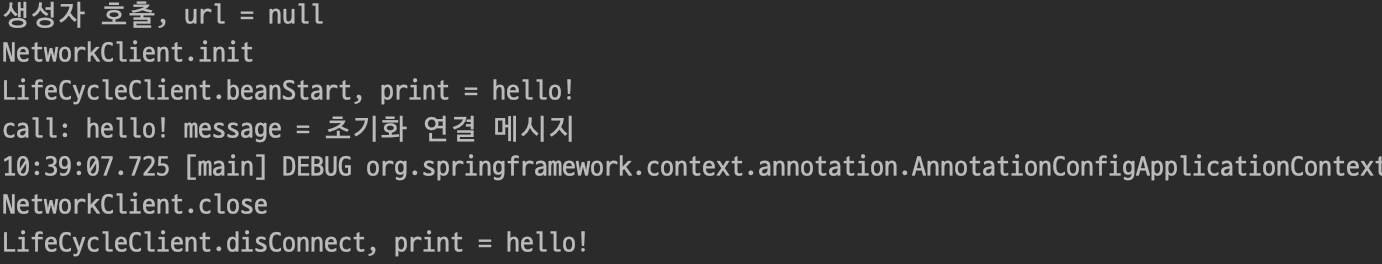 빈의 로직들이 실행이 되고, 소멸 전 콜백 실행 해 소멸이 되는 것을 볼 수 있다.