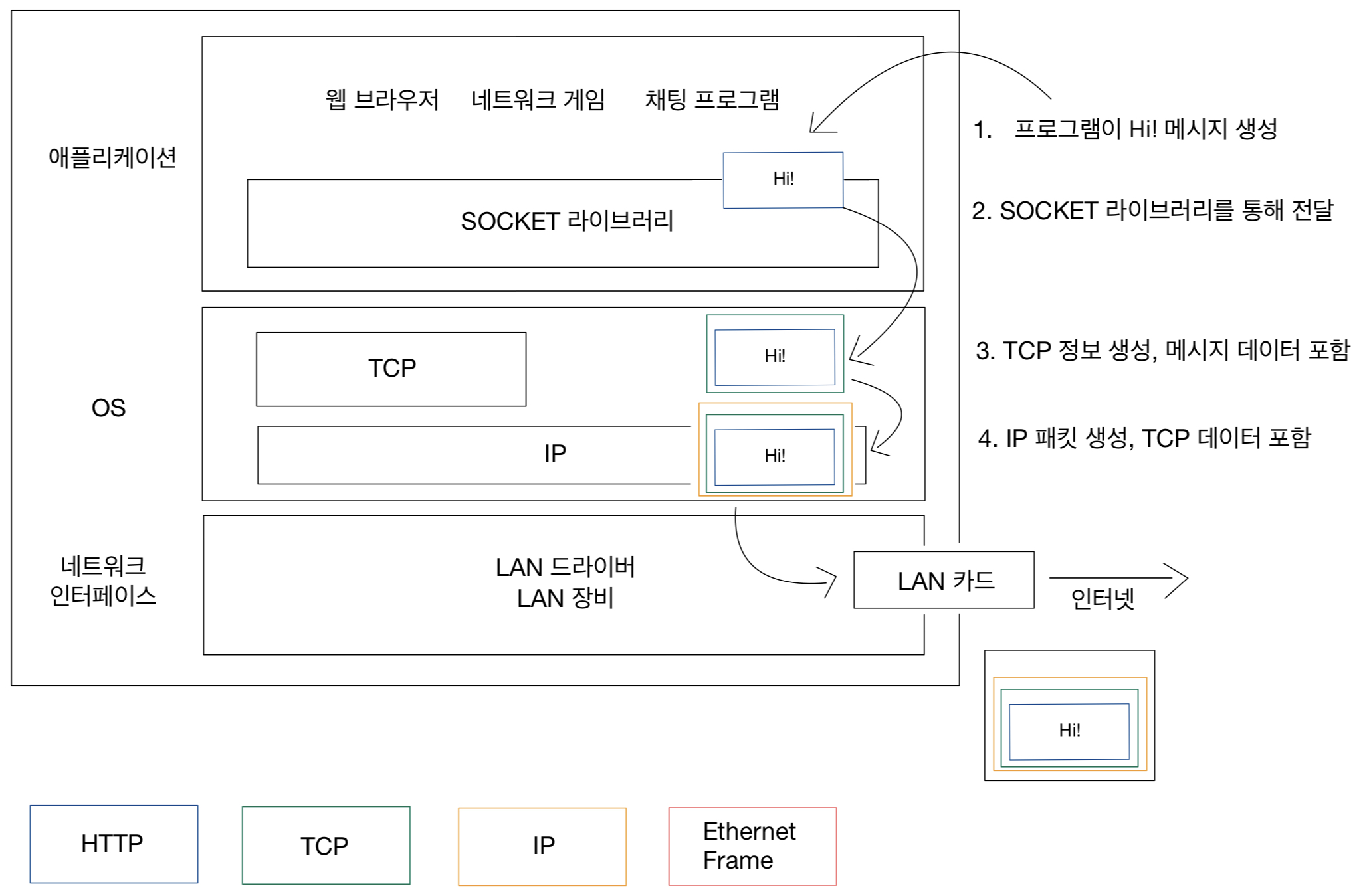 IP 패킷으로 포장하기 전에 TCP 하나를 추가하게 되는 것인데