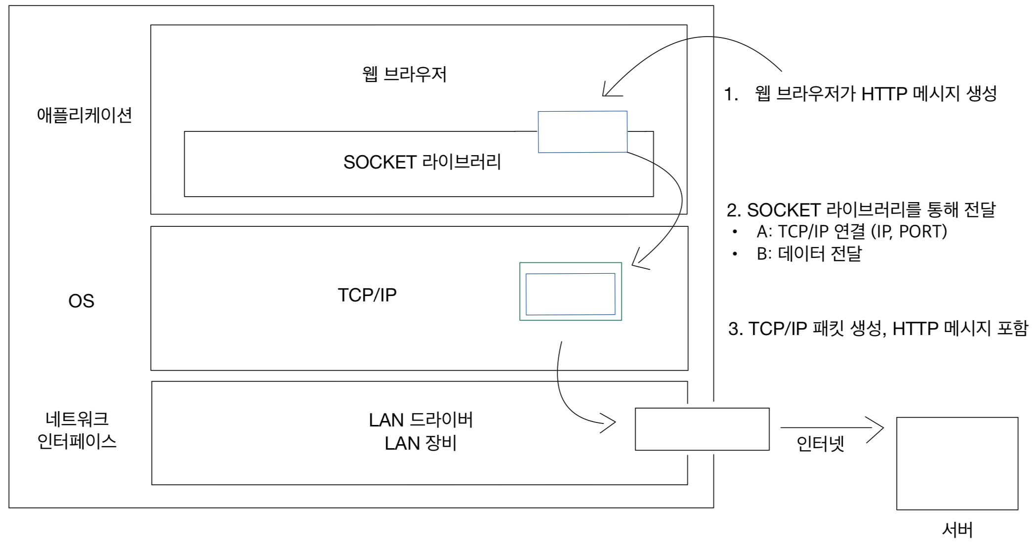 그 HTTP 요청 메시지가 단계를 거치며 포장이 되어 서버로 갈 것이다.