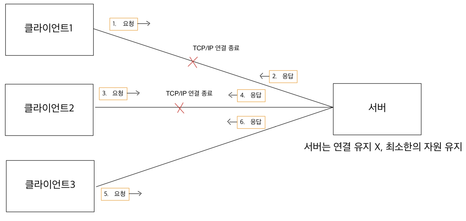 하지만 연결을 유지하지 않는 모델은 응답을 받으면 TCP/IP 연결을 종료한다.