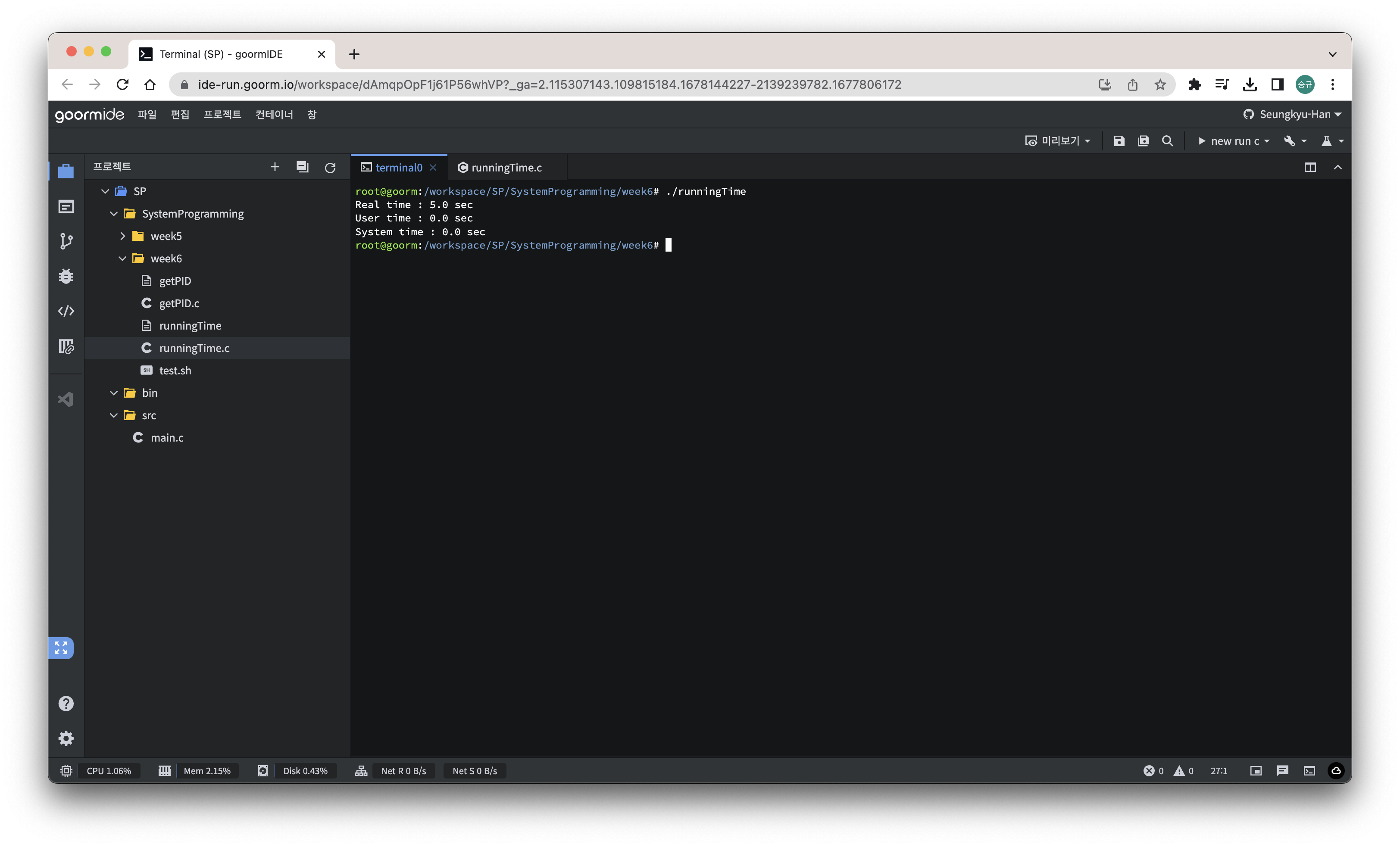 User running time은 사용자 모드에서 수행한 시간으로 사용자 작성 코드를 실행하는데 걸린 시간이다.