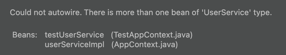 현재 운영, 테스트가 공통으로 사용하는 AppContext와 TestAppContext 이렇게 2개가 있고 여기 모두에서 UserService 타입의 빈이 정의되어있다.