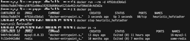 이렇게 -d 옵션을 넣어주면, 이전과는 다르게 바로 컨테이너가 실행되었다고 나오고 터미널과는 분리되는 것을 볼 수 있다.