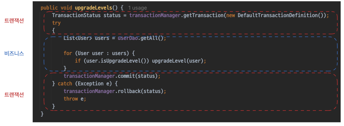 기존에 만들었던 upgradeLevels()를 보면 비즈니스 로직을 트랜잭션 설정들이 감싸고 있는 것을 볼 수 있다.