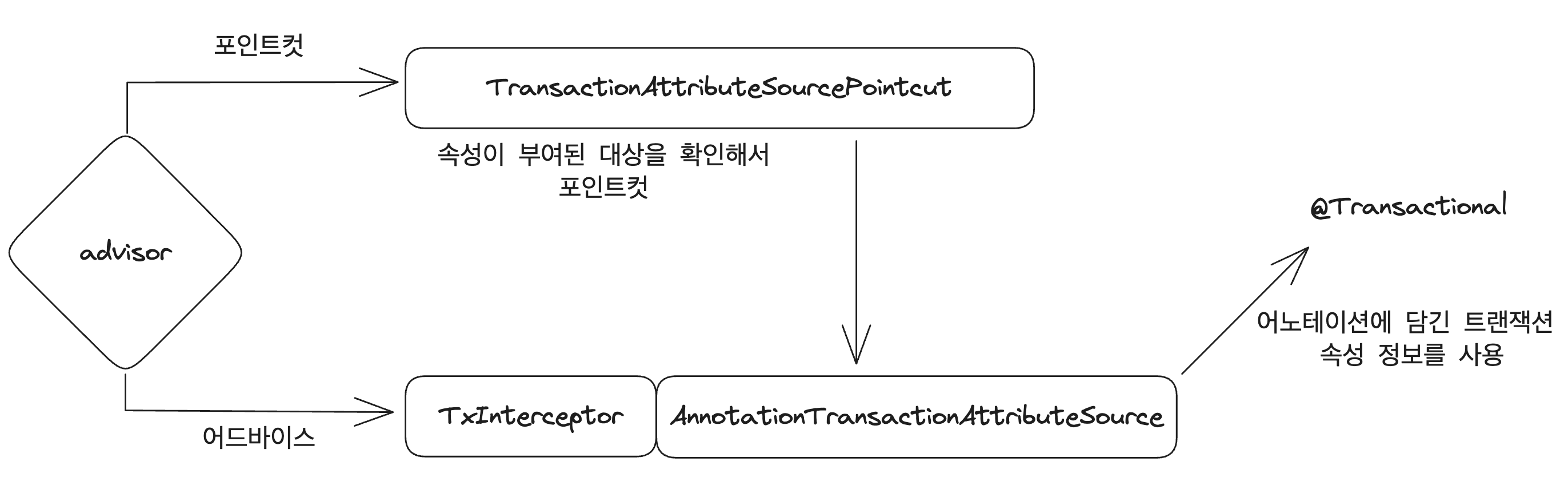 우선 AnnotationTransactionAttributeSource가 @Transactional 어노테이션에서 트랜잭션 속성을 가져온다.