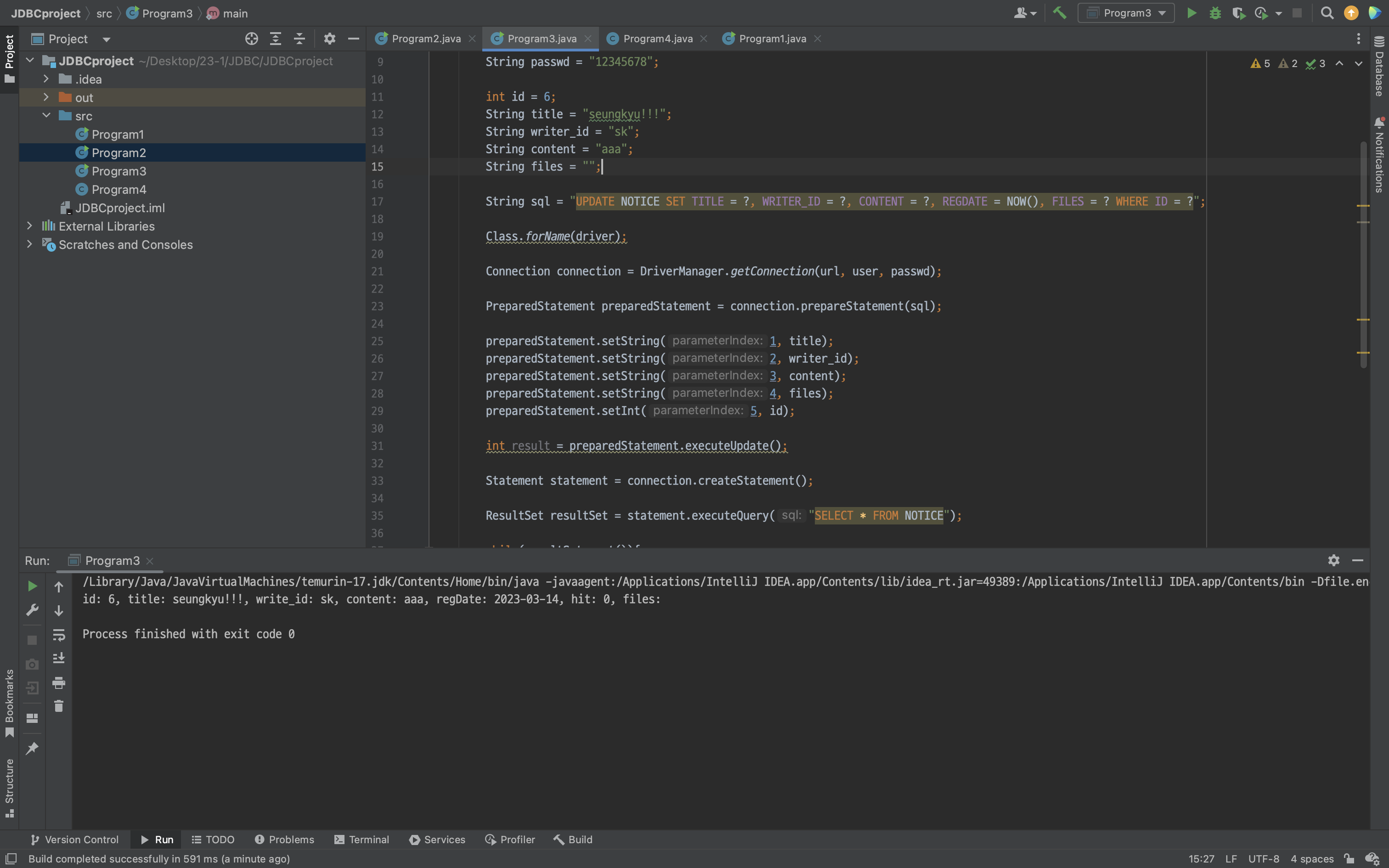 기본적인 내용들은 크게 변하지는 statement를 PreparedStatement, executeQuery를 executeUpdate로 변경해주어야 한다.
