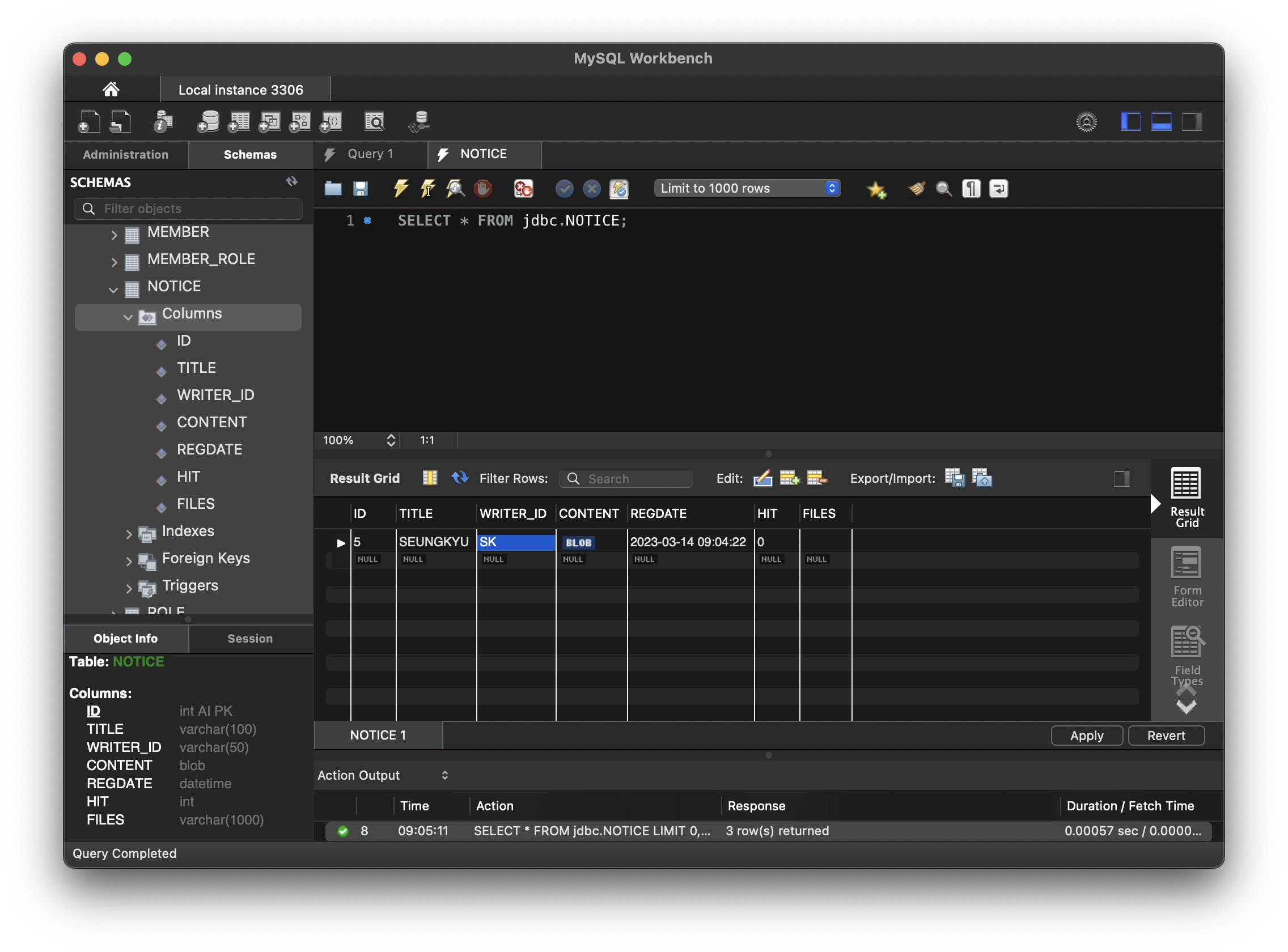 String sql = "INSERT INTO NOTICE (TITLE, WRITER_ID, CONTENT, REGDATE, FILES) VALUES (?, ?, ?, NOW(),?)";
